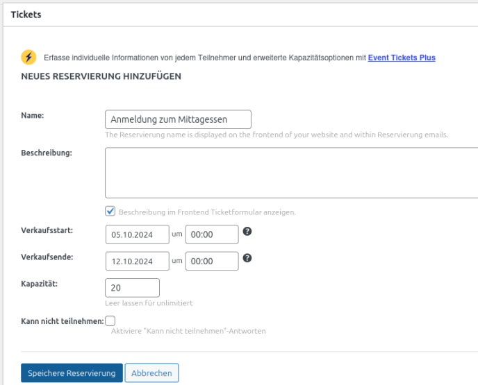 Um eine Anmeldung für die Veranstaltung zu erstellen, erstelle eine "Neue Reservierung" unterhalb der Veranstaltungsbeschreibung.