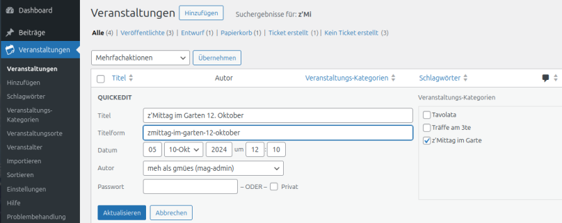 2. Quickedit der kopierten Veranstaltung öffnen und den Titel und die Titelform anpassen. Achtung: Das Datum hier ist das Veröffentlichungsdatum der Veranstaltung und nicht das Datum an welchem es stattfindet.