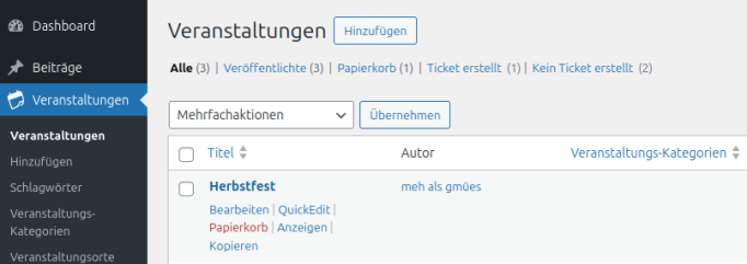 Öffne dann links im Menü die Veranstaltungen. Hier kannst du bestehende Veranstaltungen bearbeiten und neue hinzufügen.